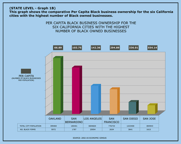 Research shows that Oakland with some 5,972 Black owned businesses, has the highest per capita Black business ownership among California’s top five cities with 100 or more Black owned businesses. This lends itself to the possibility of Oakland’s Black owned businesses coming together under the BrownPagesOnline.com’s Electronic Commercial District concept to work collectively to keep the dollar in “CityEast” community, create jobs and reduce unemployment in our targeted “CityEast” community. See the bar graph below: