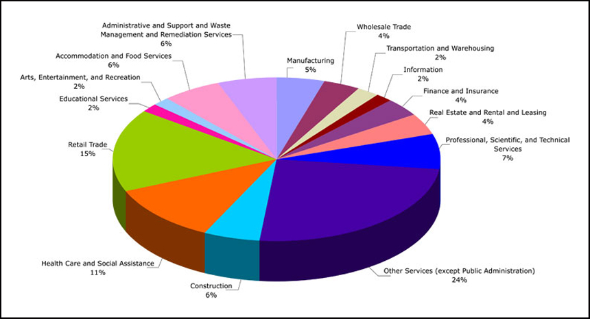 The businesses in BrownPagesOnline.com database have been classified according to the industry they are in, in accordance with the North American Industry Classification System (NAICS) which is a system adopted and used jointly by Canada, the USA and Mexico to industry classify businesses in these three countries. The businesses in the BrownPagesOnline.com database are classified according to industry as shown in the pie chart below: